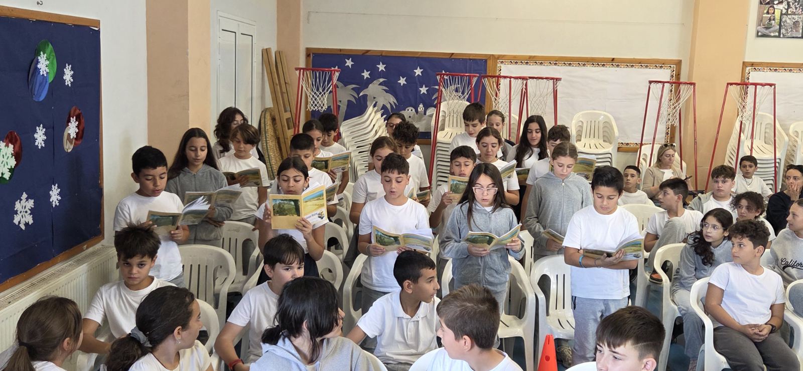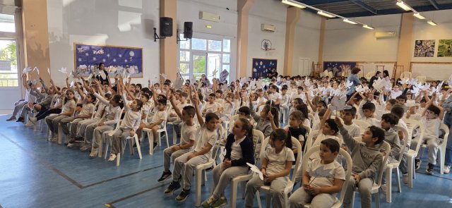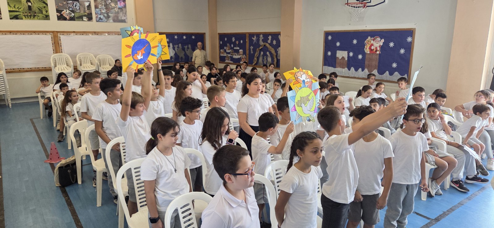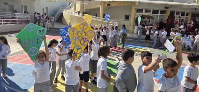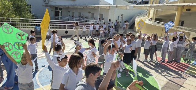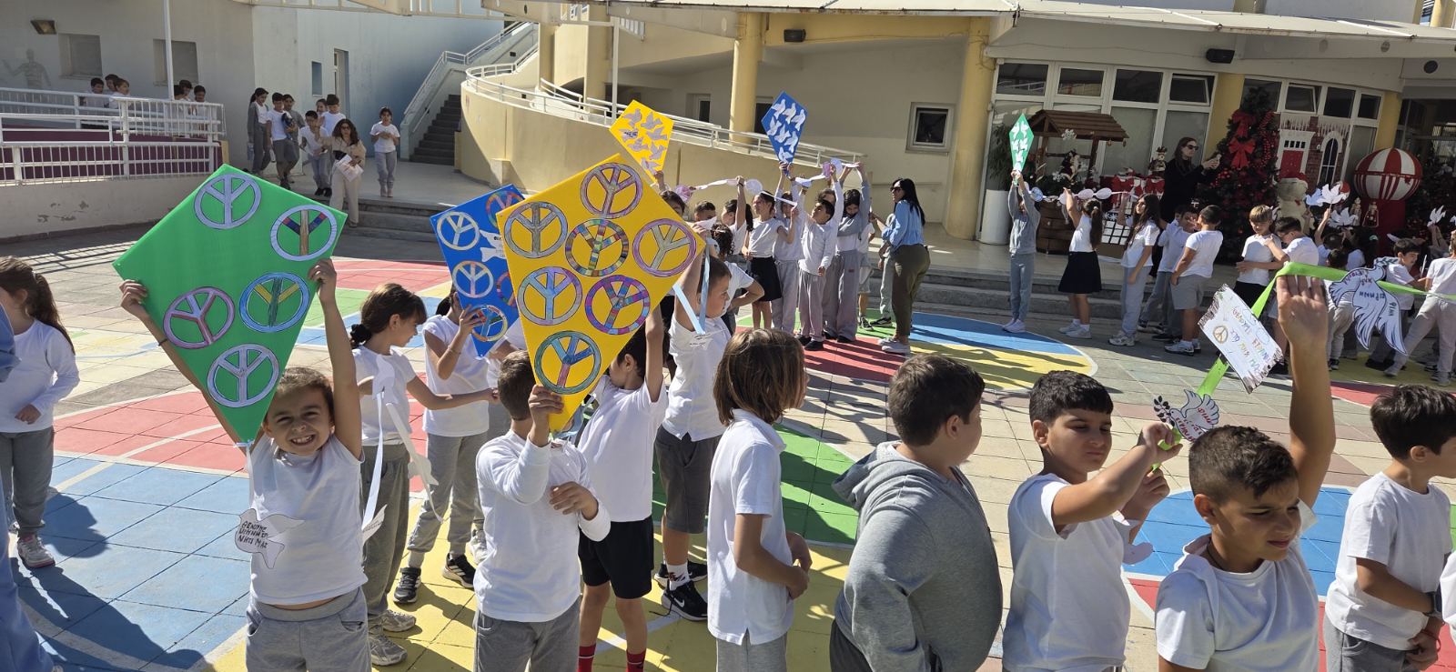 Δευτέρα, 17 Νοεμβρίου 2025, τα παιδιά του σχολείου μας συγκεντρώθηκαν στην αίθουσα εκδηλώσεων για να εκφράσουν τη διαμαρτυρία τους για την ανακήρυξη του κατεχόμενου τμήματος του νησιού μας ως κράτος. Με πολύ συναίσθημα παρουσίασαν κατασκευές με σύμβολα ειρήνης και ενότητας, απήγγειλαν ποιήματα και σήκωσαν πλακάτ με δυνατά μηνύματα. Τραγούδησαν πατριωτικά και ειρηνικά τραγούδια και στο τέλος πραγματοποίησαν πορεία στο προαύλιο του σχολείου, δείχνοντας πως παραμένουν ενωμένα ενάντια στην αδικία και ονειρεύονται μια ελεύθερη και επανενωμένη πατρίδα.