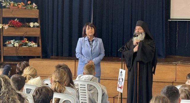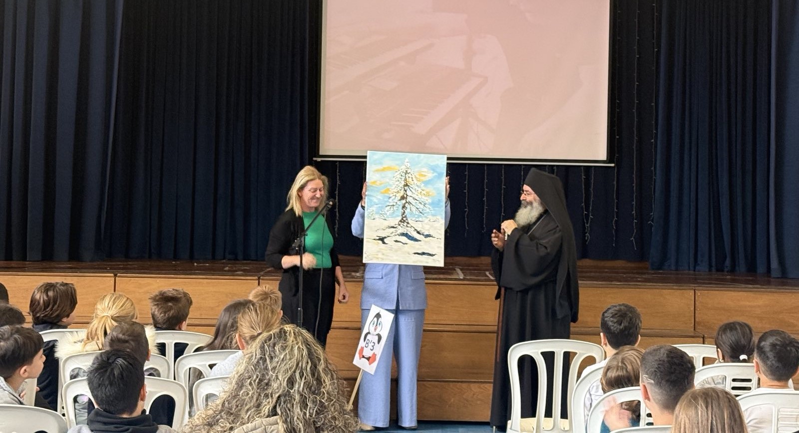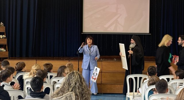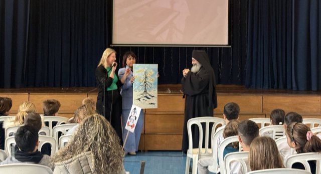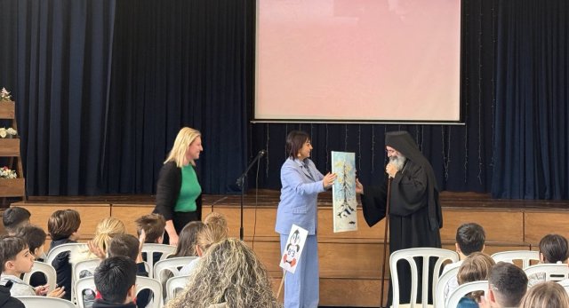 Ακολούθως, όλα τα παιδιά του σχολείου μας άκουσαν με προσοχή τις όμορφες συμβουλές και τα λόγια αγάπης του Θεοφιλέστατου. Στη συνέχεια, η κ Νίκη δώρισε ένα Πίνακα Ζωγραφικής στον Θεοφιλέστατο, ο οποίος στο τέλος της εκδήλωσης μοίρασε βιβλιαράκια με θέμα τη Θεία Λειτουργία και τη Θεία Κοινωνία σε όλα τα παιδιά και σε όλες/όλους τους εκπαιδευτικούς του σχολείου μας.