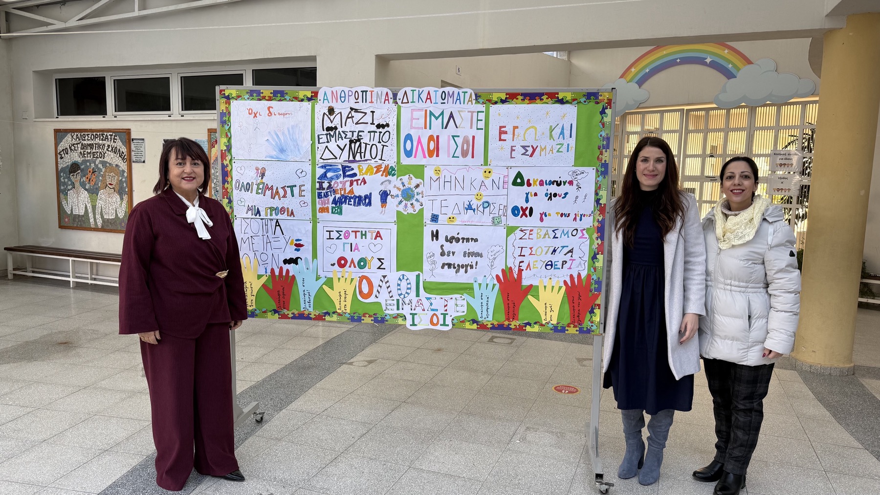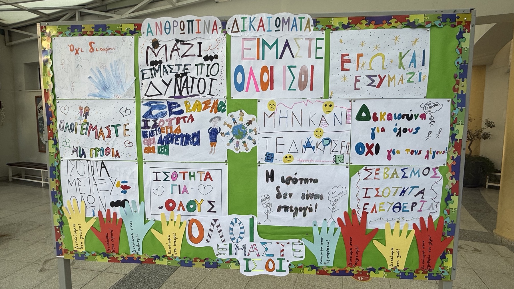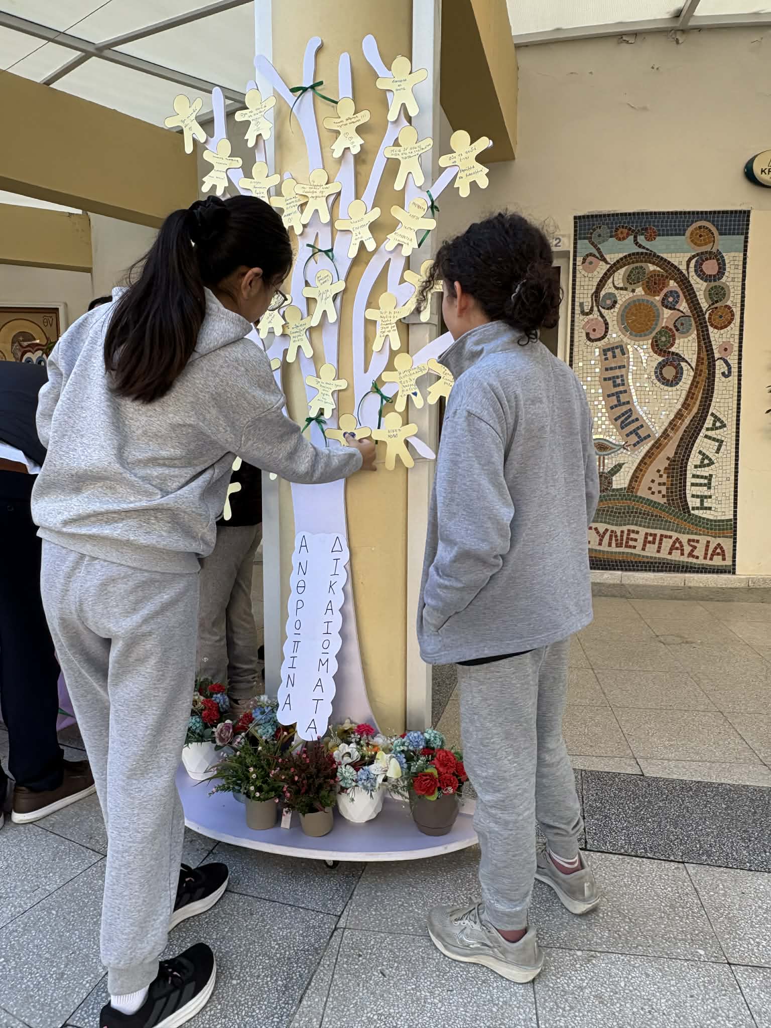 Στο πλαίσιο του μαθήματος «Αγωγή Υγείας» τα παιδιά της Ε'2 ασχολήθηκαν με την αξία των ανθρωπίνων δικαιωμάτων κι έφτιαξαν τις δικές τους αφίσες με συνθήματα για την ισότητα μεταξύ όλων των ανθρώπων. Το πρωί της Πέμπτης, στις 19 Φεβρουαρίου, υποδέχτηκαν τους γονείς στο σχολείο και τους κάλεσαν να γράψουν μια ευχή ή ένα σύνθημα για τα ανθρώπινα δικαιώματα ώστε να φτιάξουν όλοι μαζί το δέντρο των ανθρωπίνων δικαιωμάτων. Η μέρα έκλεισε με το τραγούδι «Έχω μάθει» από τα παιδιά της Α' τάξης.